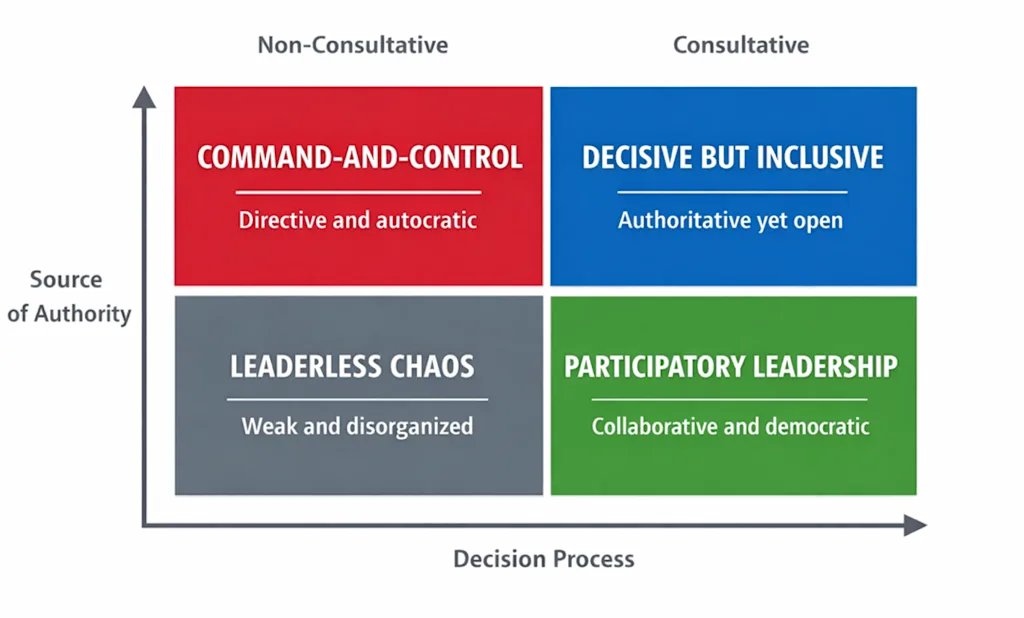 Finally, in the bottom-right quadrant, where authority is distributed and the decision process is consultative, we find participatory leadership. This style is collaborative and democratic, with shared decision-making and broad involvement. It can be highly effective in knowledge-intensive settings with skilled teams, though it may slow decisions and create coordination challenges if not carefully managed.