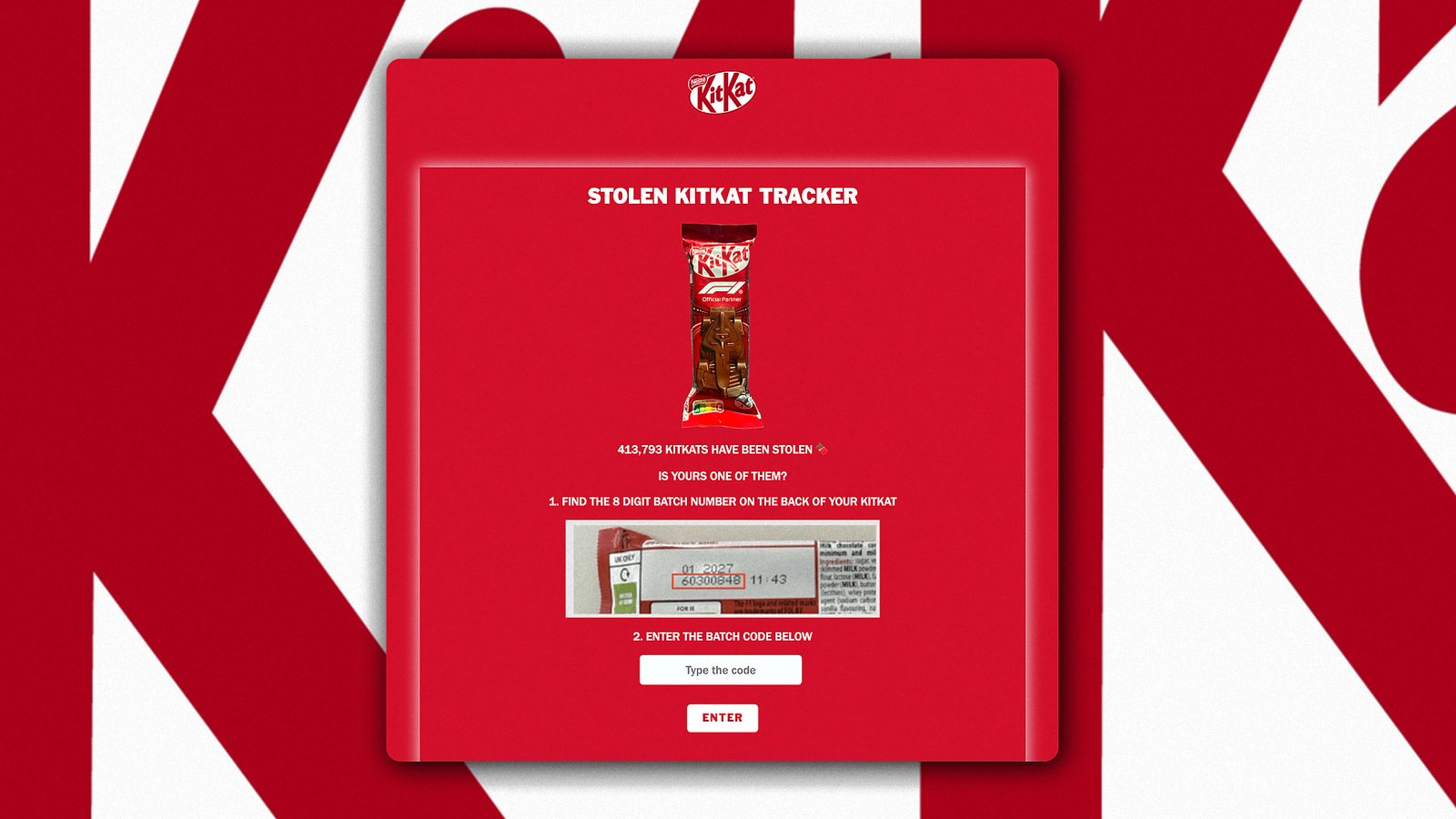 The Stolen KitKat Tracker is single-purpose landing page with an exceedingly simple layout. The red-washed website shows consumers where they can find the batch number on KitKat packaging, and it asks them to enter the code in a small text box at the bottom of the page.